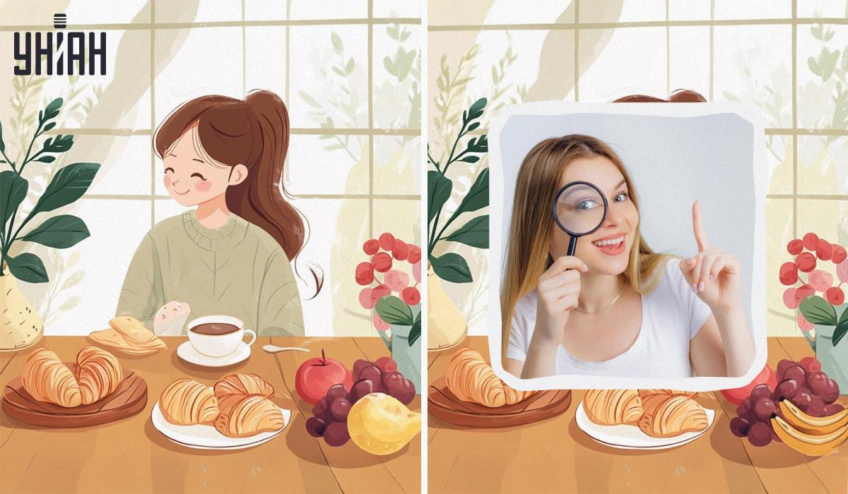 Οι εικόνες δείχνουν ένα χαριτωμένο κορίτσι να απολαμβάνει το πρωινό του στην κουζίνα του. Πίνει καφέ (ή τσάι) μαζί με νόστιμα κρουασάν. Και για επιδόρπιο, αναμένεται να έχει φρουτάκια. Οι εικόνες φαίνονται σχεδόν πανομοιότυπες, με τέσσερις λεπτές διαφορές μεταξύ τους. Θα μπορέσετε να τις βρείτε;
