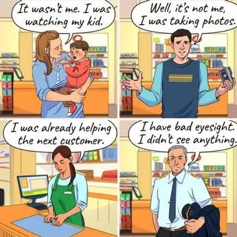 Στην παραπάνω φωτογραφία φαίνονται τέσσερα άτομα και μόνο ένας από αυτούς λέει ψέματα για το άλλοθί του. Πρώτον, η μαμά με το μωρό λέει ότι δεν μπορούσε να πάρει το πορτοφόλι επειδή “πρόσεχε το μωρό”, και ο άνδρας με τη φωτογραφική μηχανή ισχυρίζεται ότι δεν ήταν αυτός επειδή “έβγαζε φωτογραφίες”.