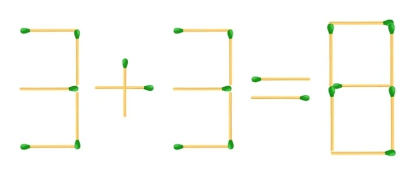 Μπροστά στα μάτια μου υπάρχει μια λανθασμένη ισότητα από σπίρτα: 3+3=8. Φαίνεται σχεδόν αδύνατο να τη διορθώσεις, αν δεν μπορείς να αφαιρέσεις ή να προσθέσεις κάτι. Ωστόσο, υπάρχει λύση, και δεν είναι καθόλου προφανής.
