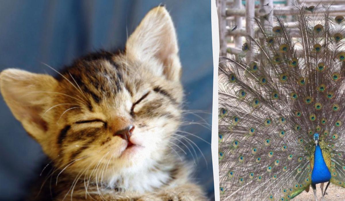 Το γατάκι βρισκόταν πίσω από την ουρά του παγωνιού / κολάζ από φωτογραφία της Moje