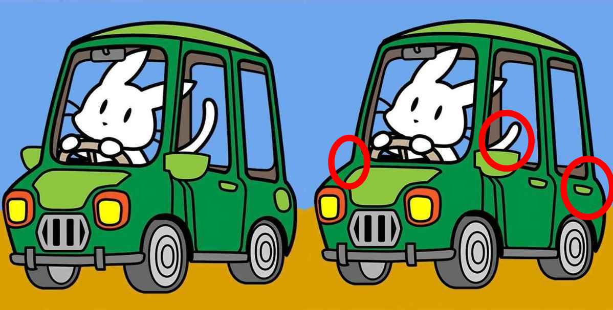 Να μια βοήθεια: στη δεύτερη εικόνα, η ουρά του κουνελιού είναι κοντύτερη από ό,τι στην πρώτη εικόνα. Επίσης, η πρώτη εικόνα έχει καθρέφτη οπισθοπορείας στο αυτοκίνητο, ενώ η δεύτερη εικόνα δεν έχει. Το δεύτερο πράσινο αυτοκίνητο, στα δεξιά, έχει χερούλι πόρτας αυτοκινήτου, ενώ η πρώτη δεν έχει.